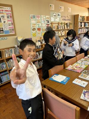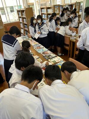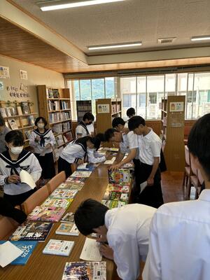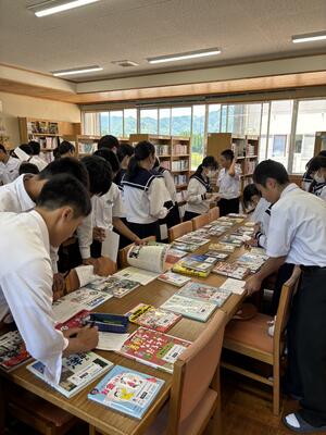 昨日の昼休み時間に、図書室に新たに所蔵する書籍を選ぶ会(選書会)を実施しました。1年間にたった1回だけ、自分が読んでみたい、読みたい書籍が蔵書されるチャンスとあり、多くの生徒の皆さんが来室しました。ご覧のとおり、大賑わいでした。来校された業者の方は、「こんなに多くの生徒がやってくるのも、日之影中ならでは・・・。また、多くの生徒の皆さんが、自分が読みたい、興味があるジャルンルをしっかりもっている。」と感心されておられました。