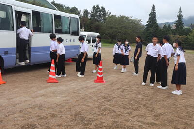本校生徒は、ほとんどの生徒がスクールバスを利用させていただいていることから、スクールバス2台をお借りし、バスの乗り方、特にバスに乗車した際の「車から見えないところ~死角~」について体験的に学び、命の大切さや交通安全に対する知識や意識を高めることをねらいとして行いました。