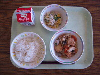 今日の給食献立は、「新タマネギのフレッシュサラダ」「鶏肉のごま味噌煮」「ご飯」「牛乳」です。