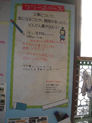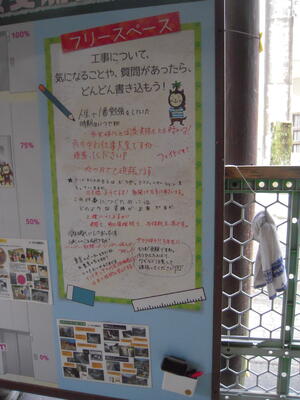 このエレベータ設置工事掲示が設置され、はや、3ヶ月が経とうとしています。様々な質問が寄せられ、その都度、丁寧に返答いただいております。この掲示板には、その時期ならではの、子どもの学校生活の様子や心理状態等が映し出されています。