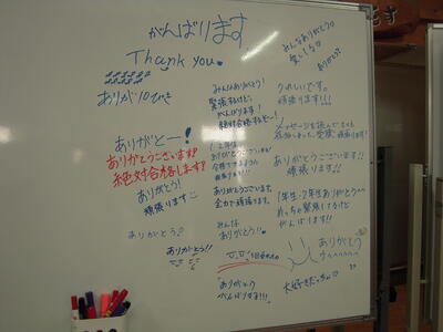 受験まっさかりの季節です。生徒会役員の皆さんが、3年生を励まそうと企画し、1・2年生からの応援メッセージがホワイトボードに書き込まれています。応援メッセージに答える受験生からのメッセージも見られます。