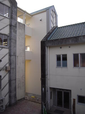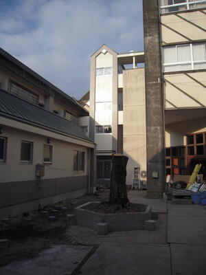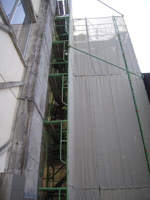 昨年8月から始まったエレベータ設置工事は、日に日にその様子が変化しています。新校舎を覆っていたシートが撤去され、エレベータホール、トイレ・印刷室が入る校舎が現れました。