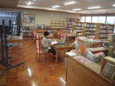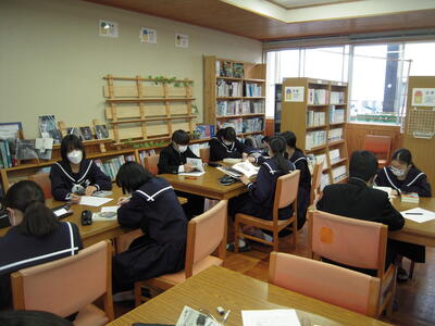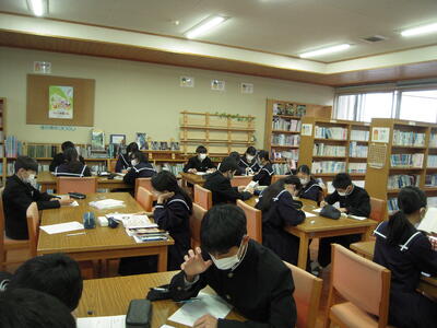 今日の2年生国語の授業は、図書室で行われています。図書室にある本の紹介を作成しています。かつて、自分が手に取り、読み、印象的だった本の紹介文のようです。一生懸命作成しています。