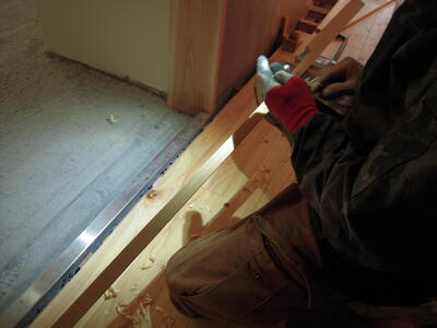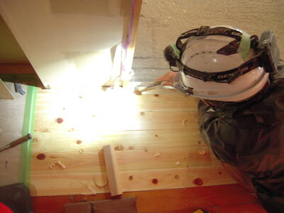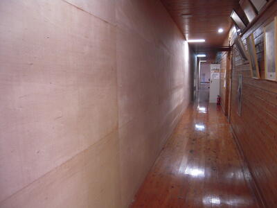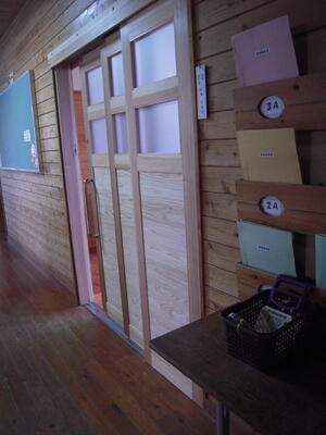 工事に訪れる職人さんの職種が変わり、最近は、大工さんです。屋外ももちろんですが、屋内工事が始まっています。職員室前の廊下の床張り、壁面張りなどです。
