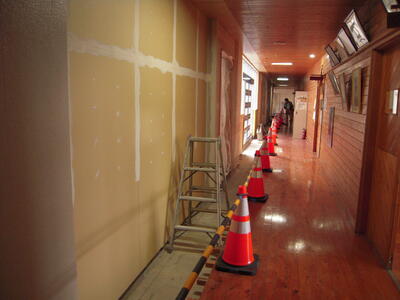 8月中旬から始まったエレベータ設置工事に伴い、職員室・保健室などがある1階廊下の一部を取り壊し、板で覆っていました。その板がいよいよ取り外されました。この板には、様々な掲示物を掲示しており、掲示板としても活躍していました。