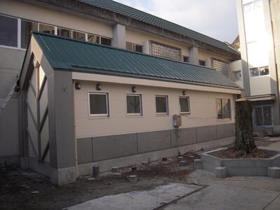 エレベータ設置工事のために、校舎の一部を取り崩しておりましたが、床や壁を張ったり、壁をペンキでぬったり、様々な職種の職人さんが目の前で作業されていました。その作業がようやく終わりました。職人さん方の作業によって再建され、綺麗になりました。