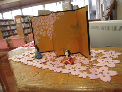 3月3日は、ひな祭りです。学校の中にも、おひなさまが飾ってあります。さて、その場所は、どこでしょうか?映り込んでいる背景を見ていたければ、分かると思います。