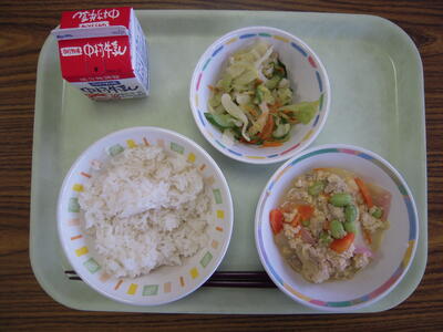今日は朝から気温が上がらず、肌寒い一日となっています。教室は朝から暖房が入っています。今日の給食献立は、「炒り豆腐」「ちくわと野菜の酢のもの」「ご飯」「牛乳」です。