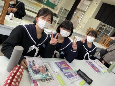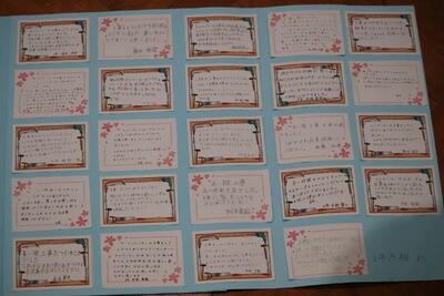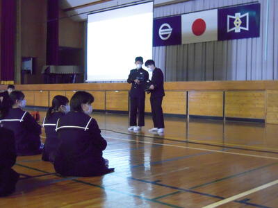 1・2年生の生徒会執行部の皆さんが、学級に呼びかけをして、寄せ書きを作成しました。甲斐 杏和さん(1年生)が生徒会を代表して、各学年からの寄せ書きを贈呈しました。