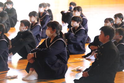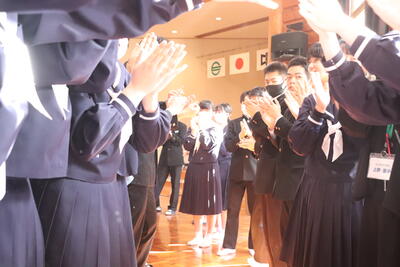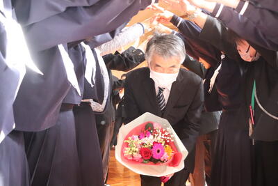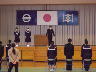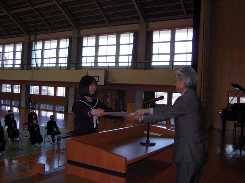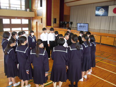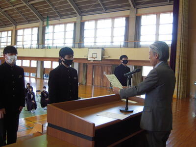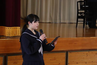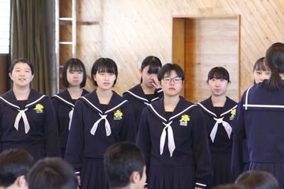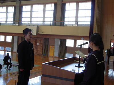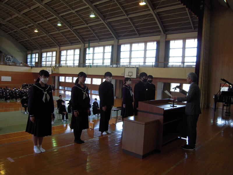 教頭 濵砂 俊洋 先生は、県教育委員会 中部教育事務所に異動になりました。事務室の大塚 道夫先生は、五ヶ瀬町立五ヶ瀬中学校に異動になりました。生徒を代表して、甲斐 文葉さんがお礼の言葉を述べました。