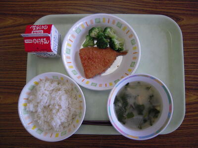 今日の給食献立は、「魚のバーベキューソースからめ」「マロニースープ」「ご飯」「牛乳」です。
