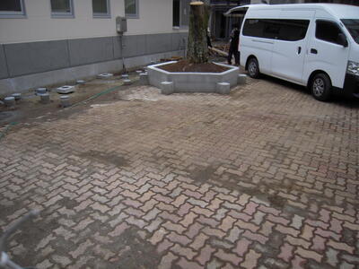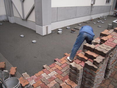 屋外では、敷地内に敷き詰めてあるレンガを1枚ずつ敷いています。大変な作業です。