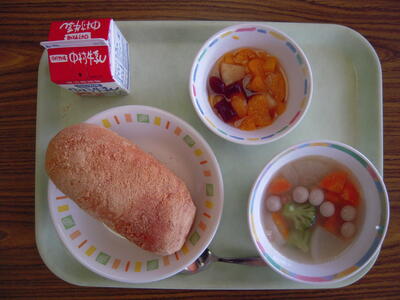 今日の給食献立は、「フィッシュバーガー」「ラビオリスープ」「牛乳」です。パンは、ひと月に2回程度、給食に出ますが、いつものように温められています。