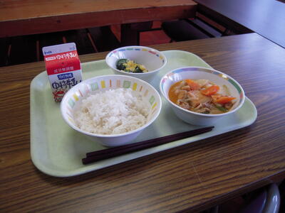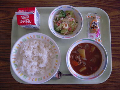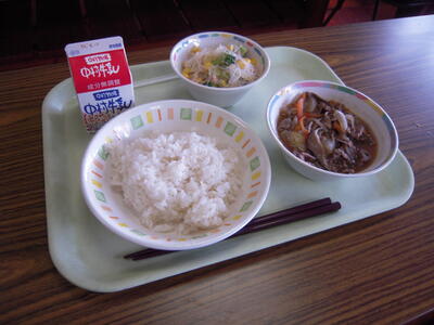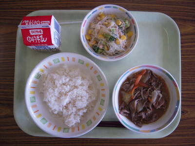 今日の給食献立は、「キムチーズ肉じゃが」「野菜のさっぱり和え」「ご飯」「牛乳」です。