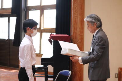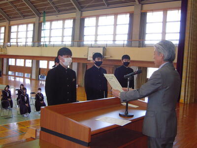 春夏秋冬、季節がうつろう中で、日之影の自然と地域・保護者に支えられ 本日、1年間の学習が終わりました。修了式では、修了証を1年生を代表して、橋本 和樹さん、2年生代表 黒田 花暖さんが受け取りました。その後、1年間を振り返り、甲斐 杏和さん(1年生代表)、興梠 真人さん(2年生代表)、飯干 蔵人さん(生徒会代表)が校長先生との対話で、1年間で成長したこと、進級するに当たっての決意、を発表しました。堂々と、意見する姿は、大きな成長を感じた時間となりました。