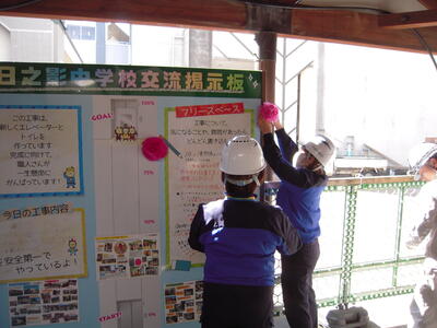昨年の8月に安全祈願祭を行って以来、約8ヶ月にわたりエレベータ設置工事が行われてきました。建設現場に出入りする多くの職種と職人さんが働く姿を目にし、「働くこと」について、子ども一人一人が自分ごととして捉えていました。また、エレベータ設置工事掲示には、子どもが数多くの質問を寄せ、それに丁寧に答えていただきました。