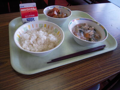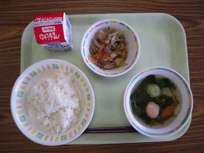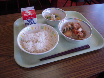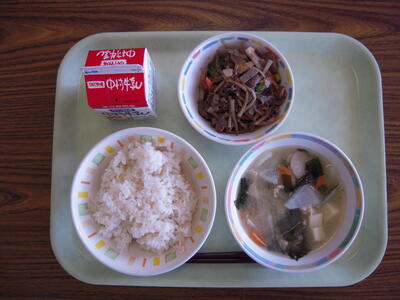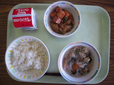 今日の給食献立は「トッポギと野菜のピリ辛炒め」「ゴボウ団子汁」「ご飯」「牛乳」です。