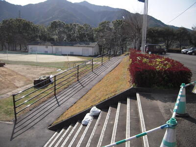 西側駐車場から運動場に行くためのスロープに手すりがつきました。これで完成かと思いきや、芝生をはるそうです。