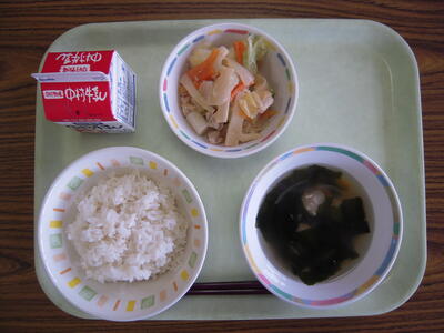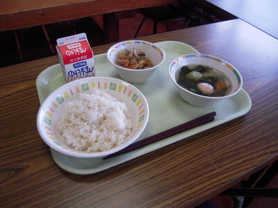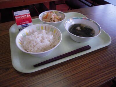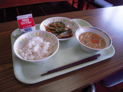 今日の給食献立は、「いわし甘露煮」「おかかあえ」「春野菜のみそしる」「ご飯」「牛乳」です。