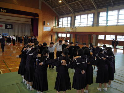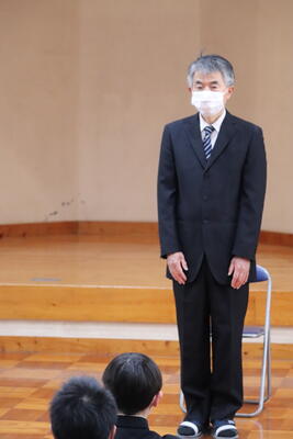 時が経つのは早いもので、一年間が終わりました。この度の教職員人事異動で2名の先生方が異動されました。その離任式を行いました。転出された先生方は、教頭 濵砂 俊洋 先生、事務室 大塚 道夫 先生の2名です。1・2年生と卒業生全員が集まってくれました。