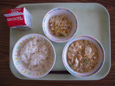 今日の給食献立は、「大根のそぼろ煮」「野菜のごま酢あえ」「ご飯」「牛乳」です。