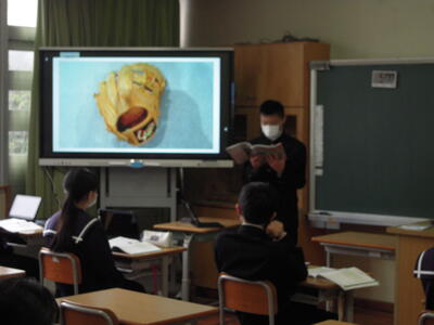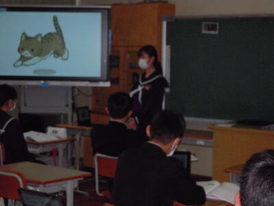 今日の1年生英語の授業は、お気に入りの写真を1枚選び、その写真について英語で説明するという授業です。その写真はモニターに投影されています。