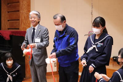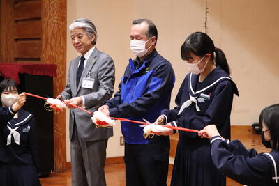 今日は、その完成を祝うために、生徒会主催で落成式を行いました。記念すべき日になりました。司会は、飯干蔵人さん、テープカットは、木田建設 唐仁原 栄 様、校長、甲斐 文葉さん でした。テープは、生徒会執行部が準備しました。