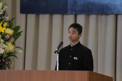 歓迎の言葉では、生徒会を代表して、飯干 蔵人さん(3年生)が学校生活や行事について、分かりやすく、優しい言葉でお話をしました。