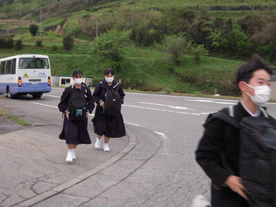 朝の登校でスクールバスで利用する子どもは、「しもじゅう交差点」で下車し、坂を上って学校に到着します。そのスクールバスをきょうだいで利用することも多く、中学生のお兄ちゃん・お姉ちゃんが登校する様子を見ています。そんな場所では、毎朝、小学生の元気な「Good morning」という声が聞こえてきます。