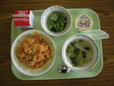 今日の給食献立は、「ワンタンスープ」「野菜のマリネ」「デザート」「チキンライス」「牛乳」です。