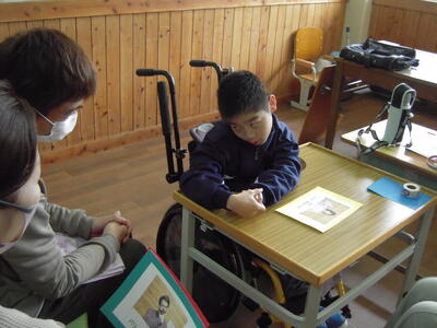 1年生国語の授業では、「言葉をひろげよう」でクロスワードを解いています。分からない言葉は、教科書を広げて調べたり、当てたり次第、先生に質問したり、誰よりも早く解こうとしています。