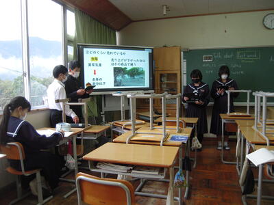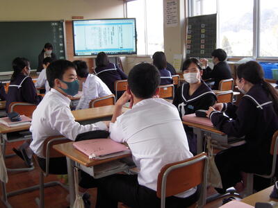 電子黒板に、デジタル教科書を写しだし、その画面に生徒の皆さんが書き込んだり、先生が書き込んだりするなど、とても便利です。それをもとに、考えを深めています。
