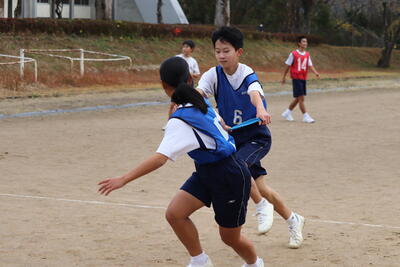 続いて駅伝の部です。チーム代表6名(女子3名、男子3名)でタスキをつないで走りました。女子は、1区・3区・5区、男子は、2区・4区・6区とし、女子は約1.5㎞、男子は約2㎞を走りました。チーム編成は、1~3年混合で5チームに分かれました。