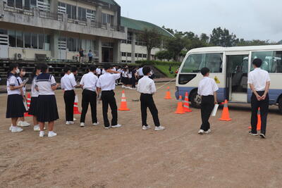 本校生徒は、ほとんどの生徒がスクールバスを利用させていただいていることから、スクールバス2台をお借りし、バスの乗り方、特にバスに乗車した際の「車から見えないところ~死角~」について体験的に学び、命の大切さや交通安全に対する知識や意識を高めることをねらいとして行いました。
