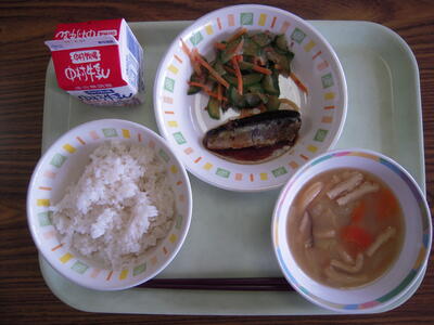 今日の給食献立は、「いわし甘露煮」「おかかあえ」「春野菜のみそしる」「ご飯」「牛乳」です。