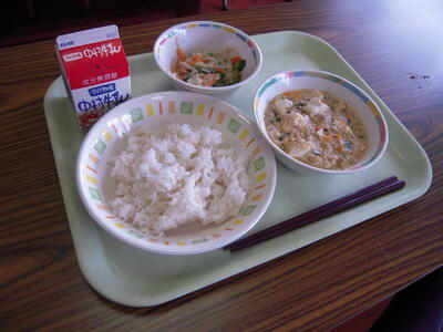 今日の給食献立は、「塩マーボー豆腐」「かみかみナムル」「ご飯」「牛乳」です。