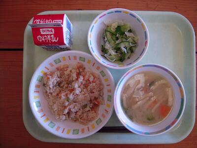 今日の給食献立は、「ばら寿司」「魚のみそ汁」「ちりめんあえ」「牛乳」です。