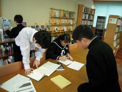 図書室で何やら、調べている1年生を見かけました。「何を調べているの?」と尋ねると、「日之影町のPRパンフレットを作るため調べています。」「具体的に何を調べているの?」と更に尋ねると、「竹細工です。日之影町の特産品の一つです。」とはっきり答えてくれました。