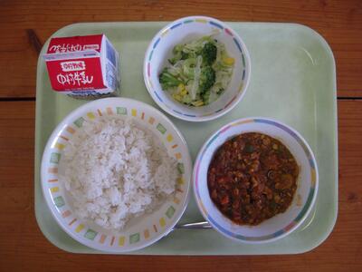 今日の給食献立は、「ドライカレー」「グリーンサラダ」「ご飯」「牛乳」です。