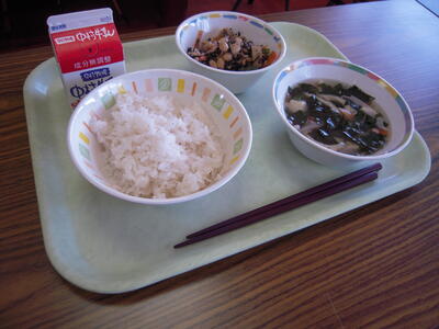 今日の給食献立は、「ひじきの炒り煮」「つぼん汁」「ご飯」「牛乳」です。