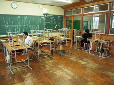 早朝からの雨が段々と強くなり、生徒の皆さんは外で遊ぶことができません。図書室では読書、体育館では大好きなバレーボールやバスケットボール、各学級では駅伝ロードレース大会に向けたポスターづくりを多く見かけました。廊下では、ALTのロバート先生に単語の発音を再度、勉強している姿もありました。