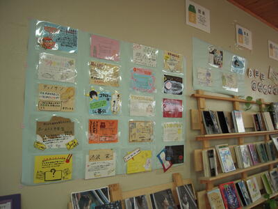 3年生が国語の授業の中で、図書室にある蔵書を分かりやすく、かつ、簡潔に紹介するポップ作品を作りました。分かりやすくするために、画用紙の色や大きさ、絵、文章を考え抜いて作ったようです。表現する活動の一つですが、生徒の皆さんはとても楽しく作っていました。素敵な作品ができあがりました。図書室に飾ってあります。