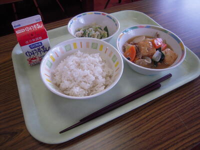 今日の給食献立は、「厚揚げの中華煮」「バンバンジー」「ご飯」「牛乳」です。