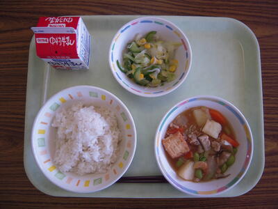 今日の給食献立は、「新じゃがの煮物」「ちりめんあえ」「ご飯」「牛乳」です。