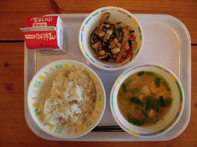 今日の給食献立は、「ひじきのいり煮」「キムチ汁」「ご飯」「牛乳」です。