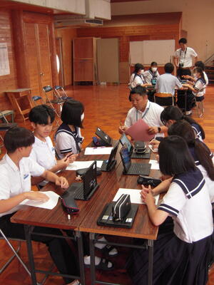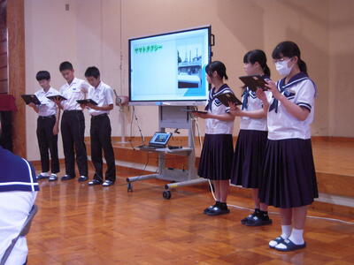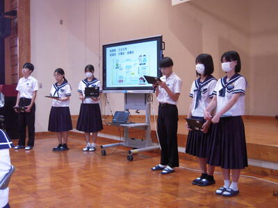 3年生が、近未来会議 中間発表会を実施しました。課題探究を検証するために、7月1日(月)にフィールドワークに出かけ、現地で学んだことや感じたことを発表しました。今年度は、4つの班(イベント、観光・遊び場、店、交通)で学んでいます。