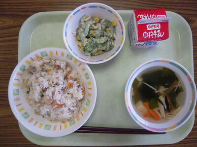 今日の給食献立は、「若竹汁」「野菜のマヨネーズあえ」「ちらしずし」「牛乳」です。
