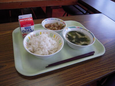 今日の給食献立は、「いわし甘露煮」「おかかあえ」「春野菜のみそしる」「ご飯」「牛乳」です。