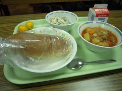 毎朝、中学生と一緒にスクールバスに乗ってくる小学生2名は、バスが停車すると窓を開けて「Good Morning」と元気な声をかけてくれます。今朝も、いつもと変わらず「Good Morning」と言った後、「今日の目標は、キンカンを食べること。」と笑顔いっぱいで言ってくれました。今日の給食献立は、「チリコンカン」「マカロニサラダ」「キンカン」「黒糖パン」「牛乳」です。「キンカン」は地産地消の食材です。