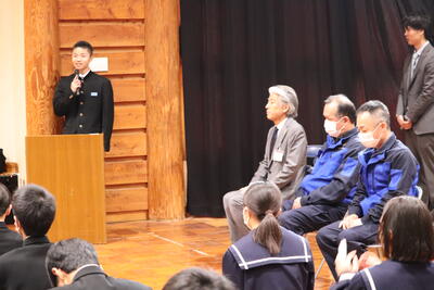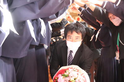 教頭 濵砂 俊洋 先生は、県教育委員会 中部教育事務所に異動になりました。事務室の大塚 道夫先生は、五ヶ瀬町立五ヶ瀬中学校に異動になりました。生徒を代表して、甲斐 文葉さんがお礼の言葉を述べました。